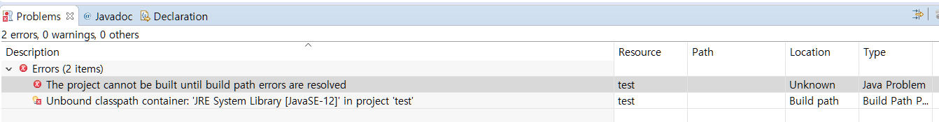 Java Build Path 에 Libararies 를 보니 JRE가 없다고 나온다.