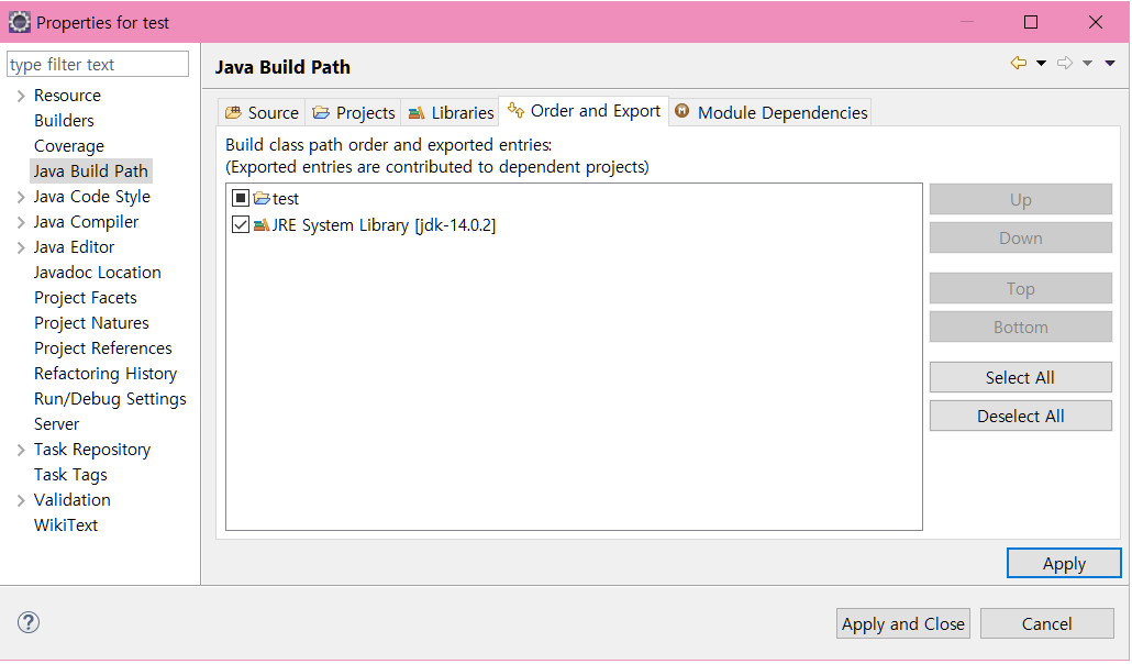 마지막으로 Order and Export 로 들어가서, JRE System Library 를 체크해준 후 Apply 를 누르면